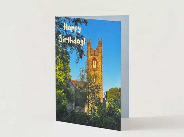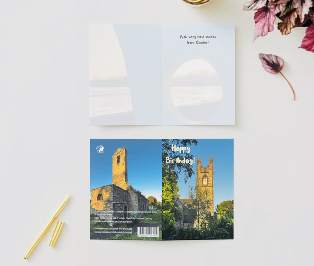 A birthday card with Scott’s and Presbyterian church in front, a ruin of John the Baptist church at the back, and a faded photo of iconic prom shelter.