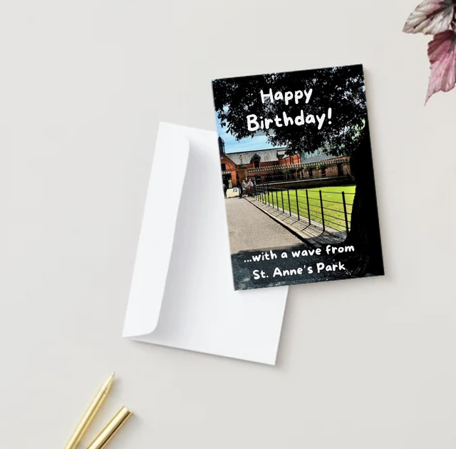 A5 birthday card with Red Stables in St. Anne’s Park. Envelope included, packed in plastic cover for protection