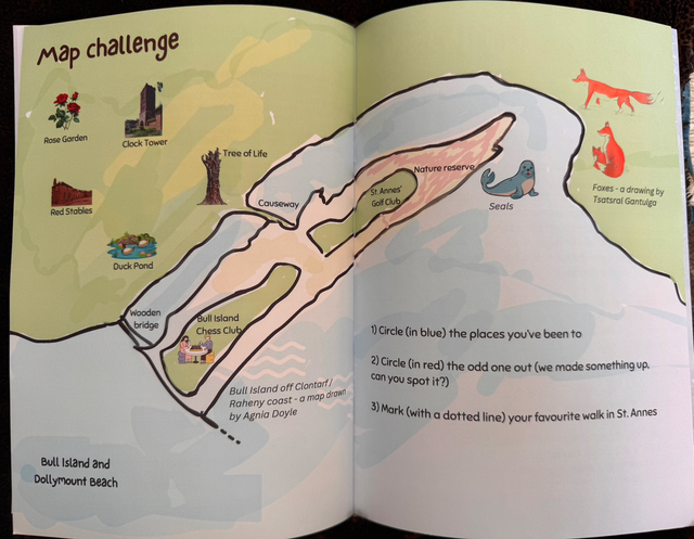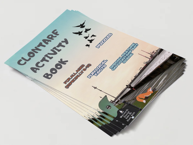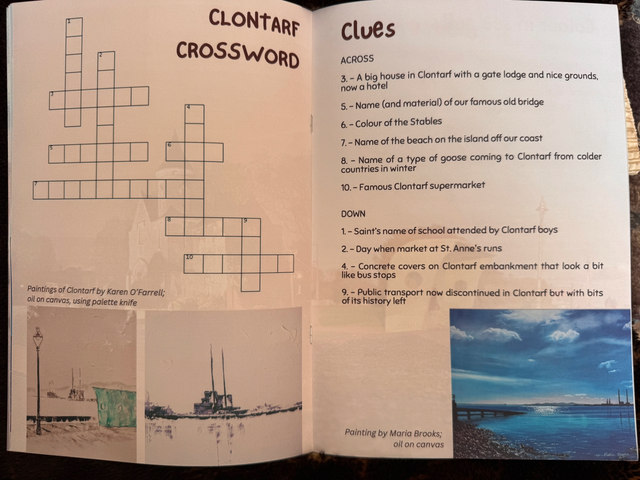 A beautiful A4 book, high quality paper, 24 pages. A set of puzzles and fun facts for local kids, with extra feature of Clontarf artists and historic trams. Lots of illustrations by local kids, and by prominent grown-up artists of Clontarf. A crossword, a Wordsearch, a connect-the-dots puzzle, spot 5 differences, map challenge etc. some, made for anyone with a Clontarf interest, especially for children of 6-12 y.o.