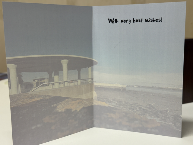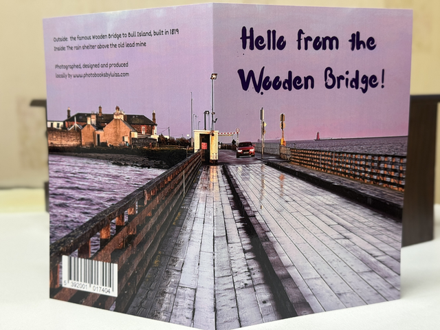 Greeting card with Wooden Bridge at sunset, with one of shelters along the prom in the inside, faded for your message. Card is A5 size, printed on high quality gloss paper, with envelope and packed for protection